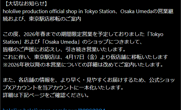 NEWS 【ホロライブ】東京駅と梅田のホロショ営業継続するみたいね