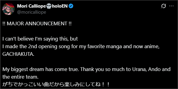 ホロライブEN 【ホロライブ】カリさんガチアクタのOP担当するのか
