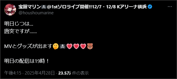 — 宝鐘マリン🏴☠️@1stソロライブ開催!!12/7・12/8 Kアリーナ横浜 (@houshoumarine) April 28, 2025
