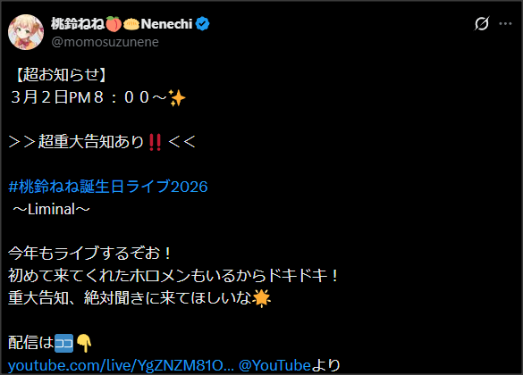 3月2日PM8:00~✨>>超重大告知あり‼<< #桃鈴ねね誕生日ライブ2026