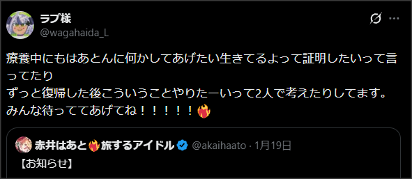 みんな待っててあげてね!!!!!❤️🔥 https://t.co/s2oCtNHiRC— ラプ様 (@wagahaida_L) January 20, 2026