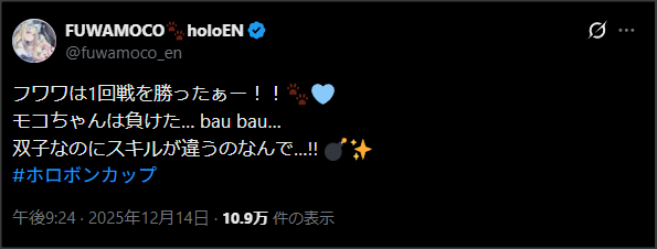 双子なのにスキルが違うのなんで…!! 💣✨#ホロボンカップ— FUWAMOCO🐾holoEN (@fuwamoco_en) December 14, 2025