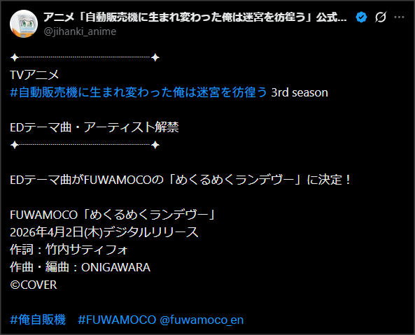 2026年4月2日(木)デジタルリリース… pic.twitter.com/L6V78eBRvd— アニメ「自動販売機に生まれ変わった俺は迷宮を彷徨う」公式@26年4月より3rd season放送開始 (@jihanki_anime) March 11, 2026