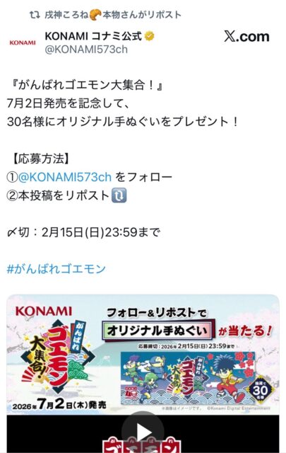 ②本投稿をリポスト🔃〆切:2月15日(日)23:59まで#がんばれゴエモン pic.twitter.com/6vzeThXAkj
