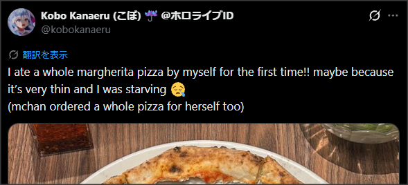 (mchan ordered a whole pizza for herself too) pic.twitter.com/DUE8pV4lcI— Kobo Kanaeru (こぼ) ☔ @ホロライブID (@kobokanaeru) January 21, 2026