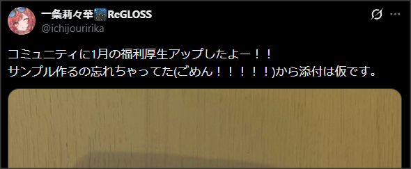 サンプル作るの忘れちゃってた(ごめん!!!!!)から添付は仮です。 pic.twitter.com/oCKXa9SCti— 一条莉々華🌃ReGLOSS (@ichijouririka) January 20, 2026
