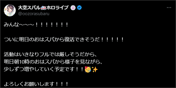 ホロライブ2期生 【ホロライブ】スバル、おはスバから復帰か