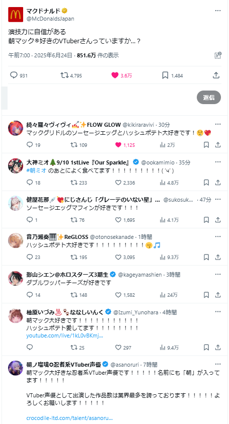 朝マック®好きのVTuberさんっていますか…?— マクドナルド (@McDonaldsJapan) June 23, 2025