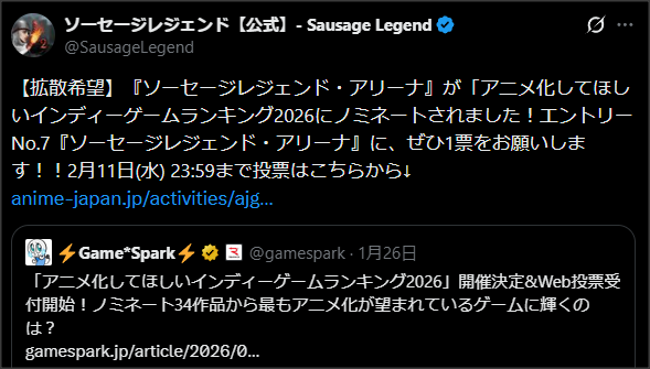 【拡散希望】『ソーセージレジェンド・アリーナ』が「アニメ化してほしいインディーゲームランキング2026にノミネートされました!エントリーNo.7『ソーセージレジェンド・アリーナ』に、ぜひ1票をお願いします!!2月11日(水) 23:59まで投票はこちらから↓